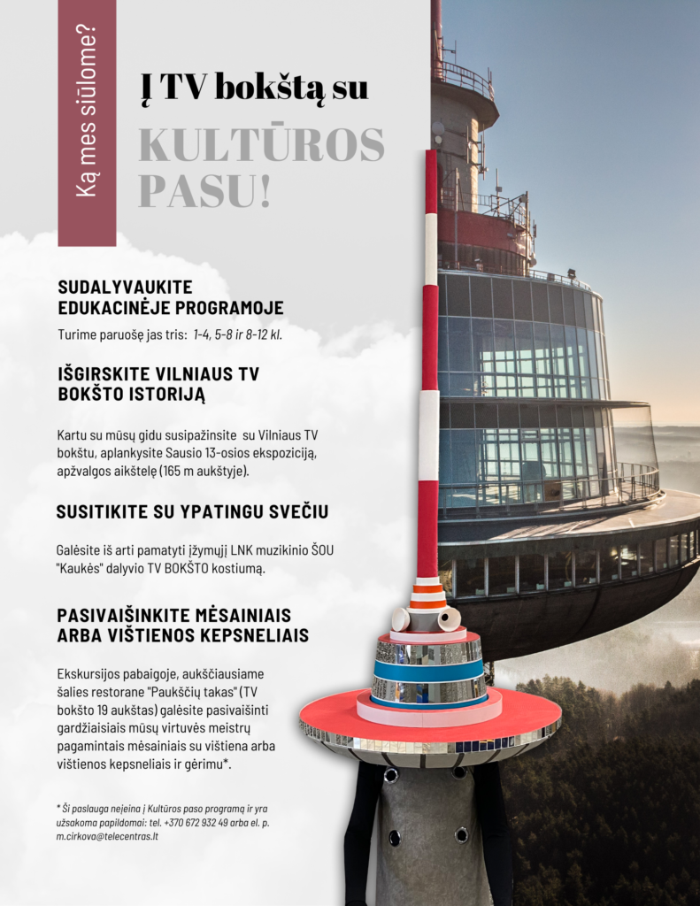 Kviečiame ir šiais metais apsilankyti Vilniaus TV bokšte pasinaudojant Kultūros paso programa. Daugiau informacijos apie programą ir registracija >>>
